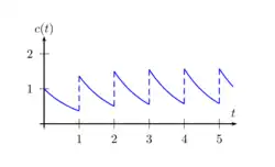 onde é a concentração e representa a dosagem ao longo do tempo . Em geral, as dosagens não são únicas e são tomadas periodicamente. Seja a concentração administrada instantaneamente a cada período Τ, então