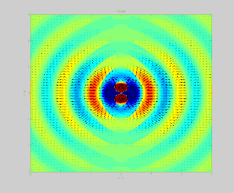 Radiação de um dipolo disposto verticalmente na página mostrando a intensidade do campo elétrico (cores) e o vetor de Poynting (setas) no plano da página.