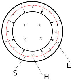 Vetor de Poynting num campo estático, onde E é o campo elétrico, H o campo magnético, e S o vetor de Poynting