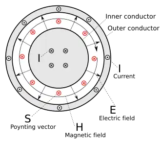 Por exemplo, o vetor de Poynting no interior do isolante dielétrico de um cabo coaxial é quase paralelo ao eixo do fio (assumindo nenhum campo externo ao cabo e um comprimento de onda mais longo que o diâmetro do cabo, incluindo DC). A energia elétrica flui quase totalmente através do dielétrico entre os condutores. Muito pouca energia flui nos condutores por si só, visto que a intensidade de campo elétrico é próxima de zero. Nenhuma energia flui fora do cabo, entanto, desde que os campos elétricos e magnéticos dos condutores internos e externos cabo se cancelam.