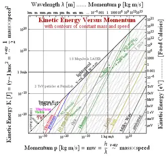 Os objetos que se encaixam perfeitamente neste gráfico são humanos dirigindo carros, partículas de poeira em movimento browniano, uma nave espacial em órbita ao redor do Sol, moléculas em temperatura ambiente, um caça a jato em Mach 3, um fóton de onda de rádio, uma pessoa se movendo a um ano-luz por ano de viajante, o pulso de um [[laser] de 1,8 MegaJoule, um elétron de 250 GeV e nosso universo observável com a energia cinética do corpo negro esperada de uma única partícula a 3 Kelvin.