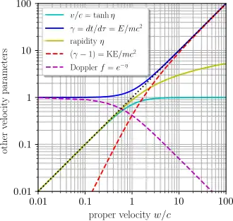 Observe-se acima que a velocidade angular η e velocidade própria w varia de 0 ao infinito e seguem a velocidade coordenada quando w << c. Por outro lado, quando w >> c, velocidade própria segue o fator de Lorentz enquanto a velocidade angular é logarítmica e, portanto, aumenta muito mais lentamente.