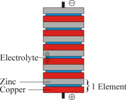 Diagrama esquemático de uma pilha voltaica cobre–zinco.