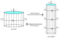A equação (3) é o equivalente atmosférico ao momento angular. Por exemplo, uma patinadora no gelo girando com os braços abertos lateralmente pode acelerar sua velocidade de rotação contraindo os braços. Da mesma forma, quando um vórtice de ar se alarga, ele, por sua vez, gira mais lentamente. Quando o ar converge horizontalmente, a velocidade do ar aumenta para manter a vorticidade potencial e a extensão vertical aumenta para conservar a massa. Por outro lado, a divergência faz com que o vórtice se espalhe, diminuindo a velocidade de rotação.