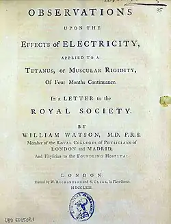 - ↑ Weisstein, Eric W. «Watson, William (1715-1787) -- from Eric Weisstein's World of Scientific Biography». scienceworld.wolfram.com (em inglês). Consultado em 3 de abril de 2022