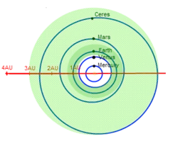 Para referência, a distância média do Sol de alguns grandes corpos dentro das várias estimativas da zona habitável é: Mercúrio, 0,39 UA; Vênus, 0,72 UA; Terra, 1 UA; Marte, 1,52 UA; Vesta, 2,36 UA; Ceres e Palas, 2,77 UA; Júpiter, 5,20 UA; Saturno, 9,58 UA. Nas estimativas mais conservadoras, apenas a Terra está dentro da zona; nas estimativas mais permissivas, até Saturno no periélio, ou Mercúrio no afélio, podem ser incluídos.