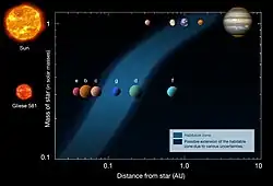A descoberta em 2007 de Gliese 581 c, a primeira Super-Terra na zona habitável, criou um interesse significativo no sistema pela comunidade científica, embora mais tarde se descobriu que o planeta tinha condições de superfície extremas que podem se assemelhar a Vênus.[138] Gliese 581 d, outro planeta no mesmo sistema e considerado um melhor candidato para habitabilidade, também foi anunciado em 2007. Sua existência foi posteriormente desconfirmada em 2014, mas apenas por um curto período de tempo. A partir de 2015, o planeta não tem desconfirmações mais recentes. Gliese 581 g, outro planeta que se acredita ter sido descoberto na zona habitável do sistema, foi considerado mais habitável do que Gliese 581 c e d. No entanto, sua existência também foi desmentida em 2014,[139] e os astrônomos estão divididos sobre sua existência.