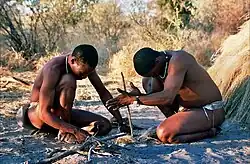 Nativos san usando um método primitivo de criar fogo