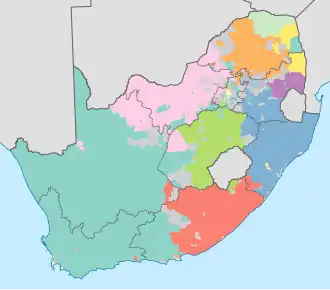 África do Sul, oficialmente República da África do Sul e mais raramente referida como Suláfrica,[8][9] é um país localizado no extremo sul da África, entre os oceanos Atlântico e Índico,[10] com 2 798 quilômetros de litoral.[11][12] É limitado pela Namíbia, Botsuana e Zimbábue ao norte; Moçambique e Essuatíni a leste; e com o Lesoto, um enclave totalmente rodeado pelo território sul-africano.[13] O país é conhecido por sua biodiversidade e pela grande variedade de culturas, idiomas e crenças religiosas. A Constituição reconhece 11 línguas oficiais.[10] Duas dessas línguas são de origem europeia: o africâner, uma língua que se originou principalmente a partir do neerlandês e que é falado pela maioria dos brancos e mestiços sul-africanos, e o inglês sul-africano, que é a língua mais falada na vida pública oficial e comercial, mas é apenas o quinto idioma mais falado em casa.[10]