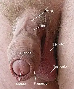 • O pênis é o órgão masculino da cópula. Sua ereção ocorre graças à entrada de sangue nas estruturas tubulares. Consiste em uma raiz e um corpo. A raiz é a parte fixa do pênis e o corpo é a parte livre ou pendular do órgão. A glande do pênis está separada do resto do corpo pelo colo da glande. Uma camada dupla de pele passa do colo para a glande, para cobri-la, o prepúcio, retirado por cirurgia em alguns homens (circuncisão ou cirurgia de fimose).