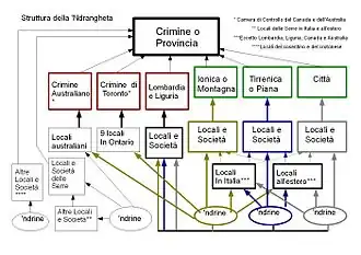 De acordo com uma Declaração de Fato acordada arquivada no tribunal, "as Locali [células locais] fora da Calábria replicam a estrutura da Calábria e estão conectadas à sua mãe Locali na Calábria. A autoridade para iniciar a Locali fora da Calábria vem do governo órgãos da organização na Calábria. Os Locali fora da Calábria fazem parte da mesma organização 'Ndrangheta da Calábria e mantêm relações estreitas com os Locali de onde vêm seus membros." As atividades do grupo na área da Grande Toronto eram controladas por um grupo conhecido como "Camera di Controllo" que "toma todas as decisões finais", segundo o depoimento da testemunha.[102] É composto por seis ou sete homens da área de Toronto, que coordenam atividades e resolvem disputas entre gângsteres da Calábria no sul de Ontário. Em 1962, Racco estabeleceu um crimini ou Camera di Controllo no Canadá com a ajuda de Giacomo Luppino e Rocco Zito.[107][108][109][110] Um dos membros era Giuseppe Coluccio, antes de ser preso e extraditado para a Itália.[111] Outros membros são Vincenzo DeMaria,[112][113] Carmine Verduci antes de sua morte,[114] e Cosimo Stalteri antes de sua morte.[73] Em agosto de 2015, o Conselho de Imigração e Refugiados do Canadá (IRB) emitiu uma ordem de deportação para Carmelo Bruzzese.[115] Bruzzese recorreu da decisão ao Tribunal Federal do Canadá, mas foi rejeitado,[115] e em 2 de outubro de 2015, Bruzzese foi escoltado para um avião em Toronto, pousando em Roma, onde foi preso pela polícia italiana.[116] O major Giuseppe De Felice, comandante dos Carabinieri, disse ao IRB que Bruzzese "assumia as funções e decisões mais importantes. Ele dava as ordens".[116]