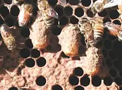 Como a larva da rainha se desenvolve pendurada de cabeça para baixo, as operárias tampam a célula com cera. Quando pronta para emergir, a nova rainha faz um corte circular ao redor da cobertura da célula. Células abertas ao lado indicam que a nova rainha foi, provavelmente, morta por uma rival.