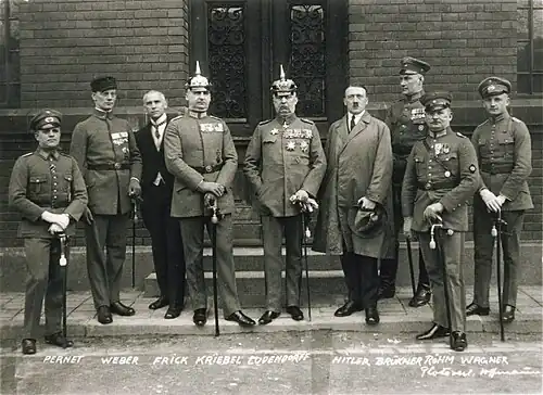 Em 1923, Hitler se aproximou do general Erich Ludendorff, que também era veterano da primeira guerra mundial, para tentar tomar o poder na Baviera através de um golpe (conhecido como "Putsch da Cervejaria"). O Partido Nazista se inspirou no fascismo italiano como modelo para sua aparência, estilo e até políticas. Hitler queria emular a "Marcha sobre Roma" de Benito Mussolini, feita em 1922, dando seu próprio golpe em Munique, desafiando o governo central em Berlim. Hitler e Ludendorff buscaram apoio do Staatskommissar (comissário do estado) Gustav Ritter von Kahr, o de facto governador da Baviera. Contudo, Kahr, junto com o chefe de polícia Hans Ritter von Seisser e o general do exército Otto von Lossow, queriam tentar seu próprio golpe e instituir no país uma ditadura militar sob sua liderança, sem a participação de Hitler.[106]