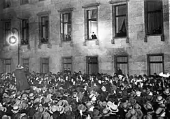 Os discursos cáusticos de Hitler na cervejaria de Munique começaram a atrair grandes multidões com muita frequência. Ele utilizava táticas populistas, incluindo o uso de bodes expiatórios, que ele culpava por todas as dificuldades econômicas dos seus ouvintes.[95][96][97] Hitler usava o magnetismo pessoal e seu entendimento da psicologia das multidões quando falava com o público. Ele sabia como falar e o que falar e em qual momento.[98][99] Historiadores notam o efeito hipnótico da oratória de Hitler, manipulando as massas.[100] Alfons Heck, um ex-membro da Juventude Hitlerista, mais tarde afirmou:
