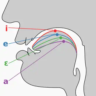 Desenho representando a posição da língua ao emitir diferentes vogais (i, e, ɛ e a)