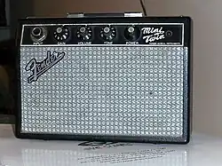 | Fender mini-twin, transistorizado. | Caixa aberta de um sistema de som automotivo, exibindo a disposição dos componentes eletrônicos do amplificador na placa de circuito impresso. |