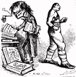 ![]() Intelectual e anti-intelectual: o cartunista político Thomas Nast compara um acadêmico a um boxeador, sintetizando a visão populista de que ler e estudar é antitético ao esporte. Assim, apresenta a cabeça e o corpo desproporcionais. | |