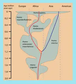 Assim, com a incorporação da evolução biológica na antropologia física, temos a antropologia biológica, que entre seu leque de temas de estudo, expande para a evolução do ser humano, desde o seu surgimento no continente africano até seu povoamento do mundo inteiro. Características tipicamente humanas, que surgiram entre 6 e 2 milhões de anos atrás, como o bipedalismo, a fala e um cérebro maior nos deram vantagens para melhor sobreviver em um ambiente aberto como a savana africana. Atributos esses que nos permitiram lutar contra predadores, caçar de forma organizada e buscar recursos em distância maiores propiciaram também que conquistássemos outros ambientes fora da África.[2]
