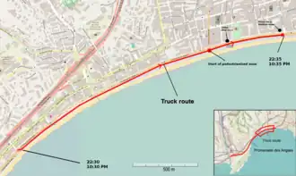 ![]() Promenade des Anglais, onde o ataque ocorreu ![]() Trajeto seguido pelo terrorista | |