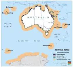 O território da Austrália tem 7 692 024 km²[72] e está sobre a placa indo-australiana. Rodeado pelos oceanos Pacífico e Índico,N4 o continente é separado da Ásia pelos mares de Arafura e Timor. Apesar de ser considerado o "menor continente do mundo"[8] a Austrália é o sexto maior país em área total,[7] (ficando atrás somente de Rússia, Canadá, China, Estados Unidos e Brasil), e devido ao seu tamanho e isolamento, é muitas vezes apelidada de "ilha continente".[73] É por vezes também considerada a "mais extensa ilha do mundo".[74] Tem 34 218 km de costa (excluindo todas as ilhas em alto-mar)[75] e reivindica uma extensa Zona Econômica Exclusiva de 8 148 250 km². Esta zona econômica exclusiva não inclui o Território Antártico Australiano.[76]