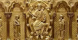 A disposição arquitetónica do tímpano foi baseada na descrição de Cristo feita por São João Evangelista no Apocalipse (cap. 1, 1-18). No centro é representado o Pantocrator, com a imagem de Cristo em Majestade mostrando nas mãos e nos pés as chagas da Crucificação. Rodeando Cristo há um tetramorfos com as figuras dos quatro evangelistas com os seus atributos: à esquerda São João com a águia, abaixo São Lucas com o boi, à direita em cima, São Mateus sobre o cofre do cobrador de impostos e abaixo São Marcos com o leão.[50]