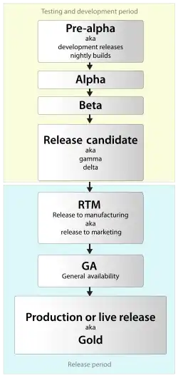 Apple Inc. usa o termo "golden master" para designar essa fase (release candidate), e o último golden master é utilizado como versão final. Outras letras do alfabeto grego, como gama e delta, são usadas para indicar versões substancialmente completas, mas ainda em fase de testes, com ômega ou zênite para versões finais de teste e tidas como livres de defeitos, prontas para produção. São especificidades de cada empresa.
