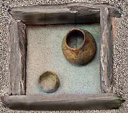 - Enterros individuais em pitos, cistas ou poços, todos levantados por plataformas circulares que apoiaram montes cobertos com uma camada de pedra.[68] Todos estão localizados fora do assentamento. Há evidências de cremações em alguns túmulos.[68] Os pitos e cistas construídos de alvenaria eram os túmulos primários e possuíam grande quantidade de bens de túmulos.[68] As cistas de pedra eram secundárias (Lêucade);[68]