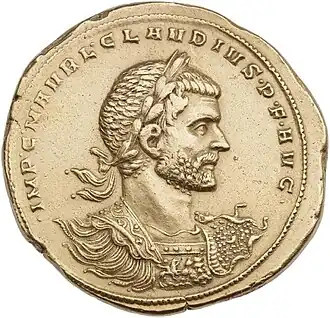 ![]() Medalhão de ouro (no valor de 8 aureus ) representando Cláudio, o Gótico. Legenda: IMP C M AURL CLAUDIUS PF AUG | |||||