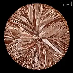 O cobre é normalmente fornecido, como quase todos os metais de uso industrial e comercial, em um grão fino de formulário policristalino. Metais policristalinos tem mais força do que formas monocristalinas, e a diferença é maior para o menor grão (de cristal) em tamanho. É facilmente trabalhado, sendo que ele tem ambas as propriedades de dúctil e maleável. A facilidade com que pode ser levado a cabo o torna útil para trabalhos elétricos, assim como sua alta condutividade elétrica.[4][5]