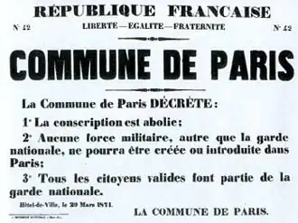 Em 18 março de 1871, na capital francesa, aconteceu o evento da Comuna de Paris: a primeira tentativa da história de um governo regido pelo proletariado, que eclodiu em forma de insurreição social contra a burguesia parisiense, o governo francês e os ataques inimigos dos exércitos alemães que lutavam na Guerra Franco-Prussiana [1870-1871]. A Comuna de Paris, porém, só seria oficialmente proclamada no dia 28 de março, após eleições - realmente universais - realizadas dois dias antes pelo povo, que resultaram na ruptura do governo parisiense com o governo de Versalhes.[30]