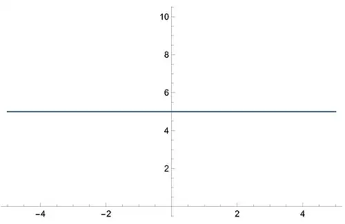 Uma constante pode ser usada para definir uma função constante que ignora seus argumentos e sempre retorna o mesmo valor.[6] Uma função constante de uma variável, como , possui um gráfico de uma linha horizontal paralela ao eixo x.[7] Tal função sempre assume o mesmo valor (neste caso, 5), pois a variável não aparece na expressão que define a função.