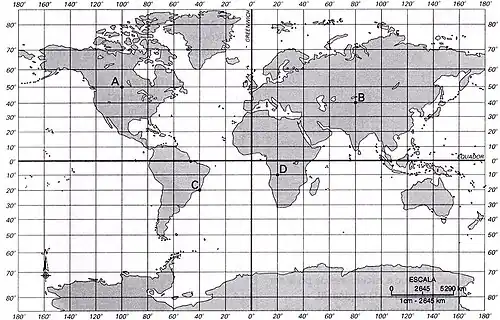 Mapa da Terra mostrando as linhas de latitude (horizontalmente) e longitude (verticalmente), projeção Eckert VI;[1]