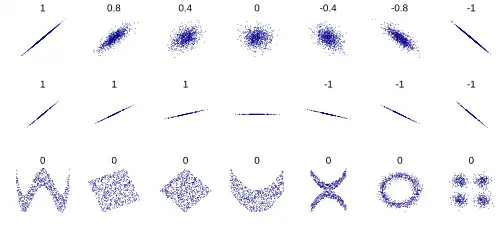Informalmente correlação é sinônimo de dependência. Formalmente variáveis são dependentes se não satisfizerem a propriedade matemática da independência probabilística. Em termos técnicos, correlação refere–se a qualquer um dos vários tipos específicos de relação entre os valores médios. Existem diferentes coeficientes de correlação ( ou ) para medir o grau de correlação. Um dos coeficientes de correlação mais conhecidos é o coeficiente de correlação de Pearson, obtido pela divisão da covariância de duas variáveis pelo produto dos seus desvios padrão[6] e sensível a uma relação linear entre duas variáveis.[7] Entretanto, há outros coeficientes de correlação mais robustos que o coeficiente de correlação de Pearson. Isto é, mais sensíveis às relações não lineares.[8][9][10]