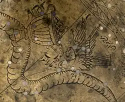 Corvus, representado no Globo Manuchihr, produzido em Mashhad entre 1632 e 1633. Colecção Adilnor, Suécia.