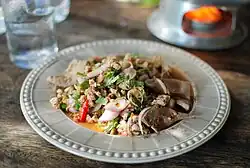 A culinária da Tailândia é caracterizada pela combinação de especiarias que proporcionam mistura de sabores e aromas variados: doce (açúcar, frutos, pimentas doces); apimentado (pimentas); ácido (vinagre, sumo de lima, tamarindo); e salgado (molho de soja, molho de peixe).[1]
