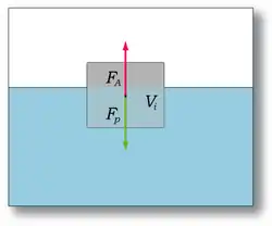 Segundo o Princípio de Arquimedes, as forças resultantes do deslocamento de um navio (FP) e de impulsão da água (FA) deverão ser iguais para o navio flutuar. O deslocamento será igual à massa de um volume de água igual ao volume imerso do navio (Vi).