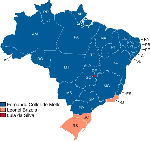 | Estado[13] | Eleitorado | Abstenção | % | Collor | % | Lula | % | Votos brancos | % | Votos nulos | % |