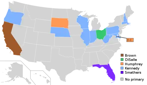 Havia dezesseis primárias. Kennedy foi escolhido em sete das primárias; Humphrey em cinco deles; Morse em três; e Brown em um. Pesquisas mostravam que Brown seria invencível na Califórnia. Morse desafiou Hubert Humphrey, na primária do Distrito de Columbia e John Kennedy nas primárias de Maryland. Em Oregon foi disputada a primária entre todos os candidatos, com exceção de Brown. Wisconsin e Virgínia Ocidental foram disputadas as primárias entre Kennedy e Humphrey. Um problema para Kennedy era sua religião Católica Romana. Recordando a experiência do candidato democrata católico de 1928, Al Smith, muitos se perguntaram se o prejuízo anti-católico feriria as chances de Kennedy ganhar a nomeação e a eleição em novembro. Para provar sua capacidade, Kennedy desafiou Hubert Humphrey, um liberal, nas primárias de Wisconsin. Embora Kennedy tenha derrotado Humphrey em Wisconsin, muitos chefes do partido não foram convencidos de que Kennedy iria ganhar votos de eleitores não-católicos. Enquanto isso, na primária do Distrito de Columbia, Humphrey havia derrotado Wayne Morse. Kennedy também derrotou Morse nas primárias de Maryland. Kennedy enfrentou Humphrey no estado fortemente protestante de Virgínia Ocidental, onde a intolerância anti-católica foi dito ser generalizada. A campanha de Humphrey foi com pouco dinheiro e não podia competir com a equipe bem-organizada e bem financiada de Kennedy. Kennedy seguiu um forte desempenho no debate televisionado de 1960,[7] profundamente derrotou Humphrey com mais de 60% dos votos. Humphrey retirou-se da corrida e Kennedy ganhou a vitória que precisava para provar aos chefes do partido que um católico poderia ganhar em um estado não-católico. Embora Kennedy tivesse apenas competido em nove primárias presidenciais,[8] o fracasso de outros principais rivais de Kennedy (Johnson e Symington) na campanha em qualquer primária indicou que eles não eram populares votados fora de seus estados de origem. Embora Stevenson tenha sido candidato presidencial do Partido Democrata em 1952 e 1956 e ainda manteve uma legião fiel de liberais e intelectuais, suas duas esmagadoras derrotas para o republicano Dwight D. Eisenhower levou a maioria dos chefes do partido para procurar uma "cara nova", que tevisse uma melhor chance de vencer a eleição geral em novembro. Nos meses que antecederam a convenção democrata, Kennedy viajou por todo o país para convencer os delegados de vários estados a apoiá-lo.