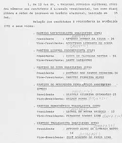 A eleição presidencial de 1989 no Brasil foi realizada em dois turnos. O primeiro aconteceu em uma quarta-feira, 15 de novembro de 1989, e o segundo em um domingo, 17 de dezembro de 1989. Foi a primeira eleição presidencial do país após a promulgação da Constituição Federal de 1988. No total, 22 candidatos a Presidente e 22 a Vice-presidente do Brasil concorreram na eleição. Os principais candidatos à presidência foram: o liberal Fernando Collor de Mello (PRN, atual Agir), o sindicalista Luiz Inácio Lula da Silva (PT), o trabalhista Leonel Brizola (PDT), o social-democrata Mário Covas (PSDB), e o conservador[1][2] Paulo Salim Maluf (PDS, atual Progressistas[3]). Foi a primeira eleição direta brasileira em que presidente e vice-presidente da República foram eleitos juntos, norma mantida nos pleitos seguintes e que continua até hoje.