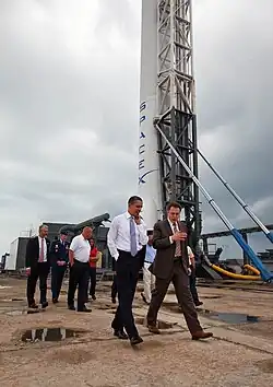 Com 100 milhões de dólares de sua fortuna inicial,[51] Musk fundou a Space Exploration Technologies, ou SpaceX, em maio de 2002.[52] Ele é diretor executivo e diretor de tecnologia (CTO) da empresa sediada em Hawthorne, Califórnia. A SpaceX desenvolve e fabrica veículos de lançamento espacial com foco no avanço do estado da tecnologia de foguetes. Os dois primeiros veículos de lançamento da empresa são os foguetes Falcon 1 e Falcon 9 (uma homenagem para a Millennium Falcon de Star Wars) e sua primeira nave espacial é a Dragon (uma homenagem para o filme Puff the Magic Dragon).[53] Em sete anos, a SpaceX projetou a família de veículos de lançamento Falcon e a nave espacial multiúso Dragon. Em setembro de 2008, o foguete Falcon 1 tornou-se o primeiro veículo de financiamento privado a colocar um satélite na órbita terrestre.[29] Em 25 de maio de 2012, a Dragon ancorou com a Estação Espacial Internacional, fazendo história como a primeira empresa comercial a lançar e embarcar um veículo para a EEI.[54]