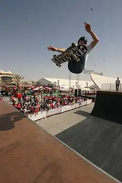 A modalidade vertical é praticada em uma pista com curvas (transições), com 3,40 m ou mais de altura, três metros de raio e quarenta centímetros de verticalização, geralmente possuem extensões. A pista, que apresenta a forma de U, é chamada de half-pipe e pode ser feita de madeira ou concreto[7]. O conceituado skatista Tony Hawk ficou famoso por suas grandes habilidades nos half-pipes. Tornou-se o que é graças à sua mãe, que comprava batatas fritas para ele sobreviver nos treinos da sua escolinha de skate, onde começou a praticar o esporte aos 3 anos de idade. Aos 6 anos, já tinha o patrocínio da Volcom, Vans, Element,entre outras. Nessa idade, já fazia flips e grinds pela cidade, onde se machucava muito. Um desses machucados, consequente de um flip "mal chutado", afastou-o do esporte durante um ano, pois ele quebrou sua perna direita e ralou todo o joelho esquerdo, o que demorou muito para curar.