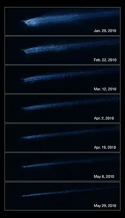 - ↑ Hubble finds that a bizarre X-shaped intruder is linked to an unseen asteroid collision, www.spacetelescope.org October 13, 2010.