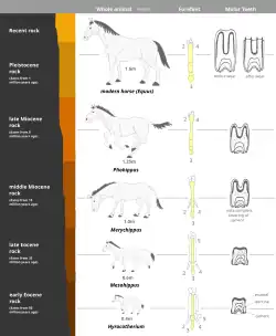 Devido à descoberta de um registro fóssil praticamente completo encontrado nos depósitos sedimentares da América do Norte do período antigo do Eoceno até o presente, o cavalo apresenta um dos melhores exemplos de história evolucionária (filogenia).
