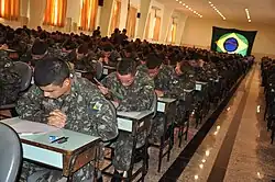 Os militares podem estar na situação da ativa ou da reserva, e se da ativa, podem ser militares de carreira (com vitaliciedade garantida ou presumida) ou temporários.[200] O efetivo fixado por decreto para o Exército em 2024 foi de 212 217 militares da ativa, dos quais 149 eram generais, 29 220 demais oficiais, 46 773 subtenentes e sargentos e 136 005 cabos e soldados.[5] De 214 mil, o International Institute for Strategic Studies (IISS) quantifica 112 mil conscritos.[201] Existem estimativas muito menores da proporção de conscritos (30%).[202] Além do pessoal na ativa, a reserva foi estimada em 1 340 000 militares pelo IISS, sem diferenciar entre as três Forças Armadas;[201] Frank McCann estima mais de um milhão de reservistas no Exército em 2017.[203] O Exército Brasileiro é historicamente um dos maiores da região.[e]