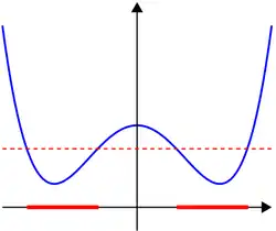 Uma função que não é quase-convexa: o conjunto de pontos no domínio da função para os quais os valores da função estão abaixo da linha vermelha tracejada é a união dos dois intervalos vermelhos, que não é um conjunto convexo.