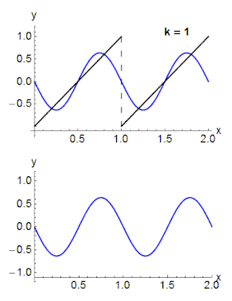 Sob condições bastante gerais, uma função periódica f (x) pode ser expressa como uma soma de ondas senoidais ou ondas cosseno em uma série de Fourier.[30] Denotando as funções de base seno ou cosseno por φk, a expansão da função periódica f (t) assume a forma: Por exemplo, a onda quadrada pode ser escrita como a série de Fourier Na animação de uma onda quadrada no canto superior direito, pode-se ver que apenas alguns termos já produzem uma aproximação razoavelmente boa. A superposição de vários termos na expansão de uma onda dente de serra é mostrada abaixo.