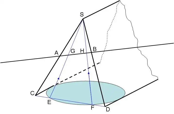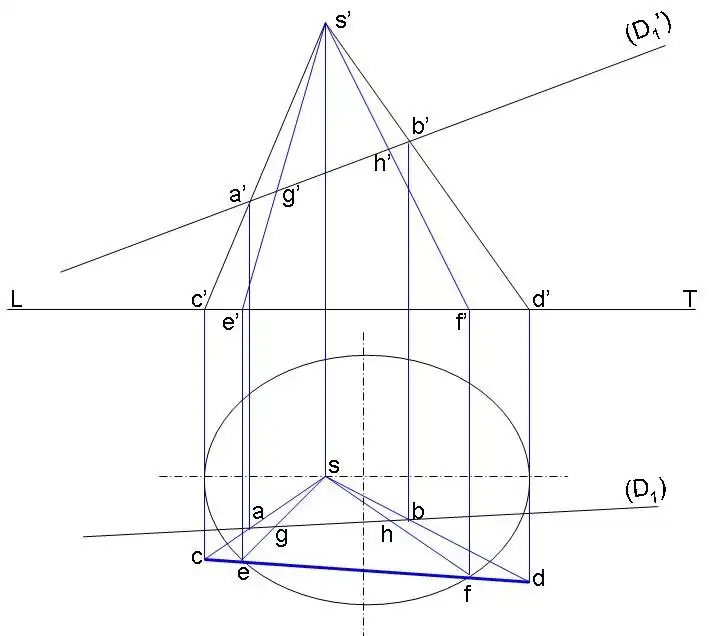 Desenho realizado com recurso a dois pontos de vista, uma frontal e outra horizontal, sendo estas duas vistas separadas por uma linha de fundo (LT), os pontos de intersecção estão representados em {G,H}.