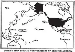Mapa pós-guerra da "Grande América", que incluía os novos territórios anexados de Cuba e Filipinas.