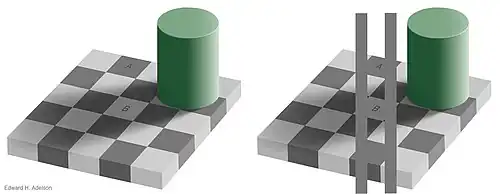 Note que vemos o quadrado A como sendo mais escuro do que o quadrado B. No entanto, como se vê pela figura da direita, em que simplesmente se adicionou duas barras com a mesma cor de A, ambos têm exatamente a mesma cor - têm a mesma luminância (a quantidade de luz visível que chega ao olho vindo da superfície é a mesma).