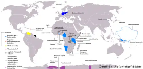 O Império colonial alemão terminou com o Tratado de Versalhes, em 1919, após a I Guerra Mundial. Entre as colônias da Alemanha estavam o Togo, Camarões, a África Alemã do Sudoeste (atualmente a Namíbia), a África Alemã Oriental (atualmente Tanzânia), três territórios que estão atualmente na Papua-Nova Guiné (Kaiser-Wilhelmsland, o Arquipélago de Bismarck, e as Ilhas Salomão alemãs), e vários territórios no Pacífico: as Ilhas Marshall, Ias lhas Caroline (atualmente os Estados Federados da Micronésia), Palau, as Marianas Alemãs (atualmente território dos Estados Unidos), e Samoa. Além disso, "a China Alemã", foi uma concessão colonial em Jiaozhou na Península de Shandong no norte da China. Previamente, em 1849, o Estado Germânico havia tentado outra aventura nas proximidades da China, em uma tentativa prussiana, mais tarde abandonada, de clamar para si a Ilha Formosa.